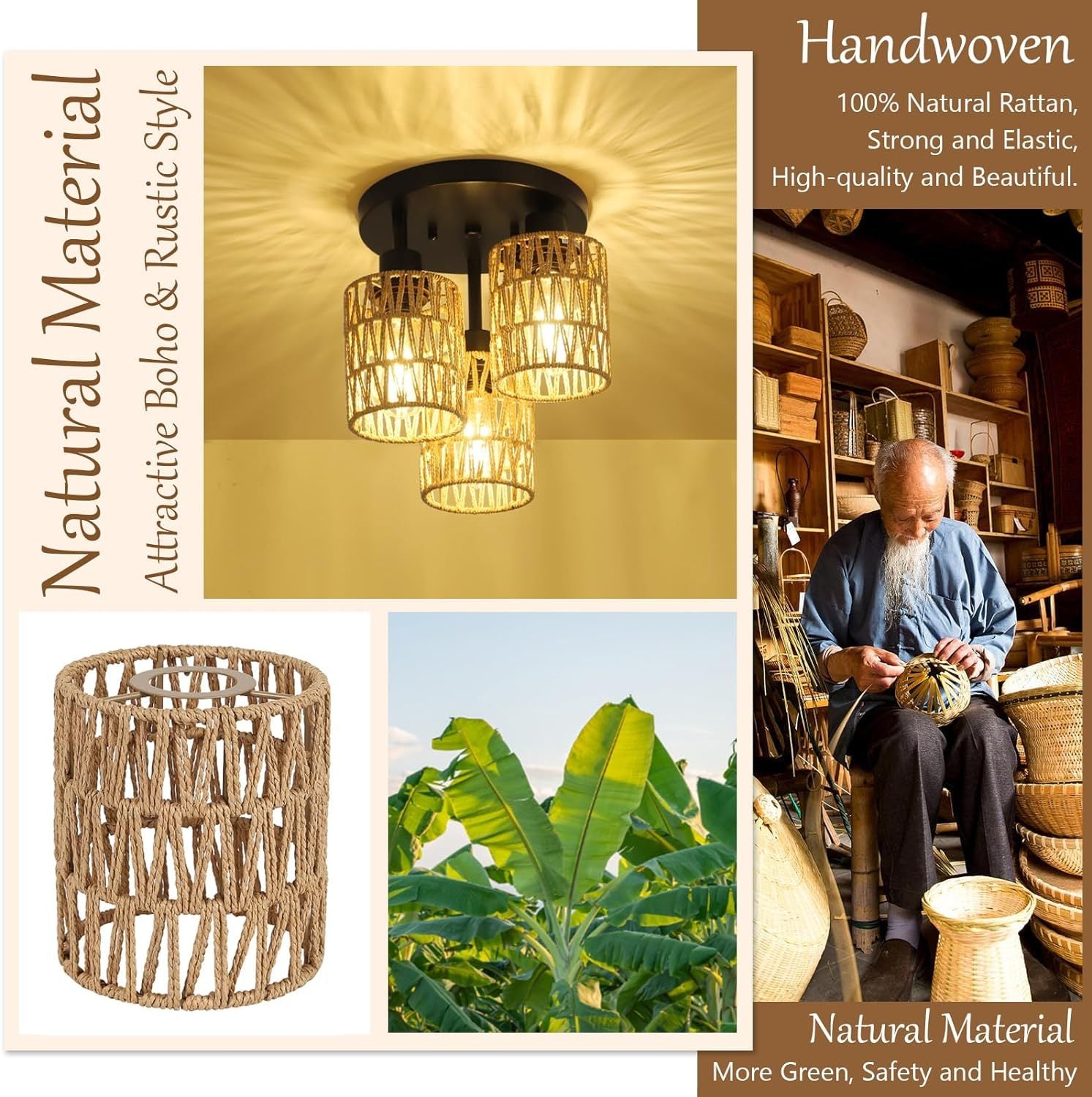 - [3-Lights Rattan Light Fixture] This semi flush mount ceiling light is made of 100% hand-woven natural rattan and durable metal, which is more Eco-friendly, safety and healthy. Never need to worry about rust, corrosion or fading. The hollow design of rattan lampshade enables this boho light fixture to emit 360 beautiful light shadow. This light fixtures ceiling mount will bring warm lights and wonderful boho atmosphere to your home!