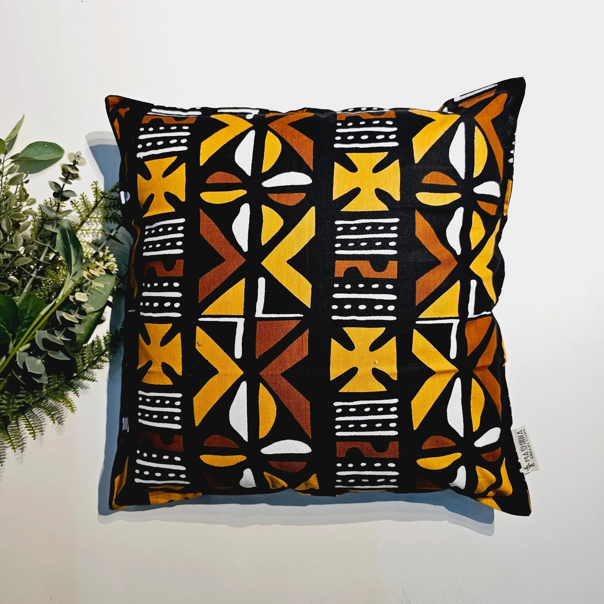 This cushion is made with vibrant African wax print cotton on the front, extra thick unbleached cotton twill on the back to create a sturdy and durable cushion, and silky piping to bring out the beautiful colours in the print to create a bold statement cushion.