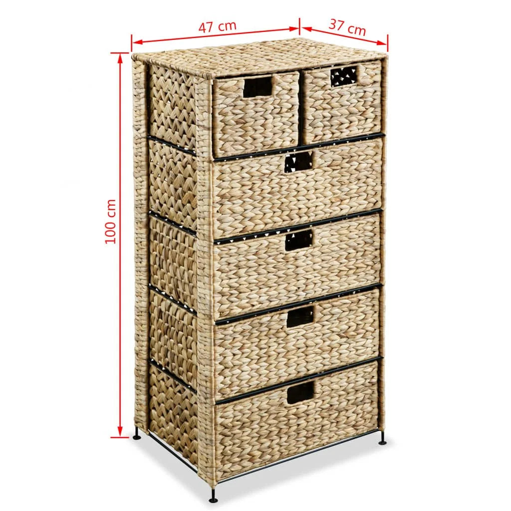 It has 5 drawers to provide ample storage space for all sorts of items. The storage unit consists of a metal frame and water hyacinth, which make it sturdy and durable. The attractive woven style adds to the cabinet's rustic charm.